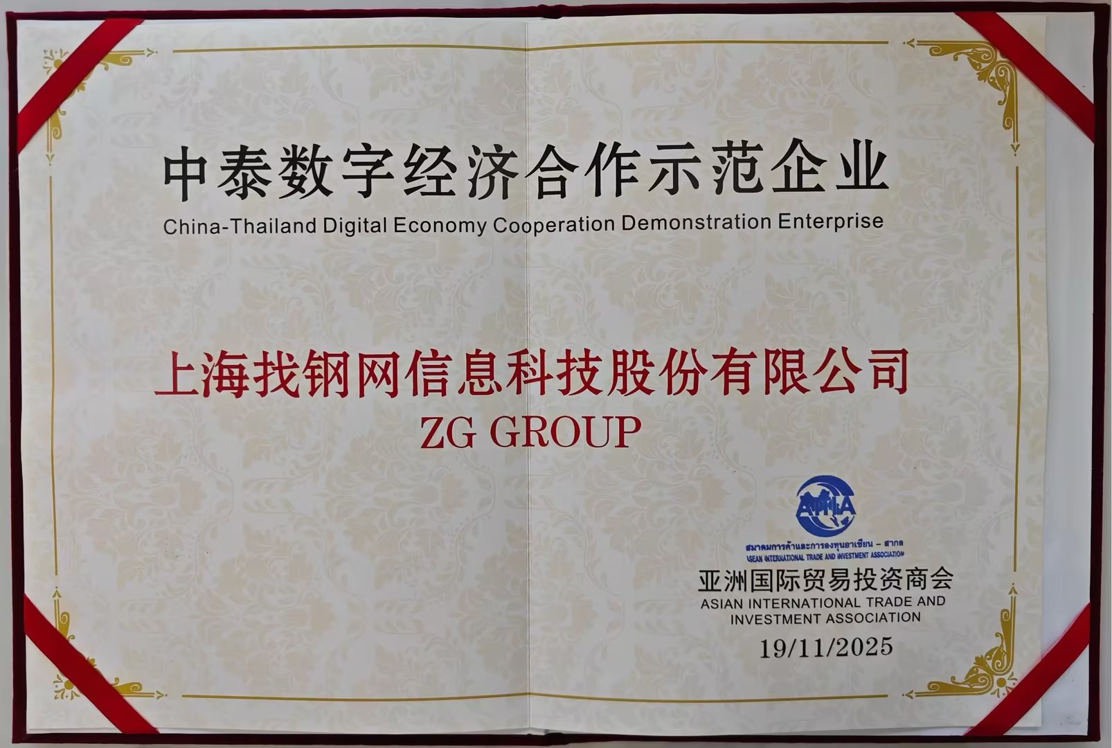2025.11.26找钢网荣获“中泰数字经济合作示范企业”称号,充分彰显了找钢国际在探索海外供应链数字化服务上的成果